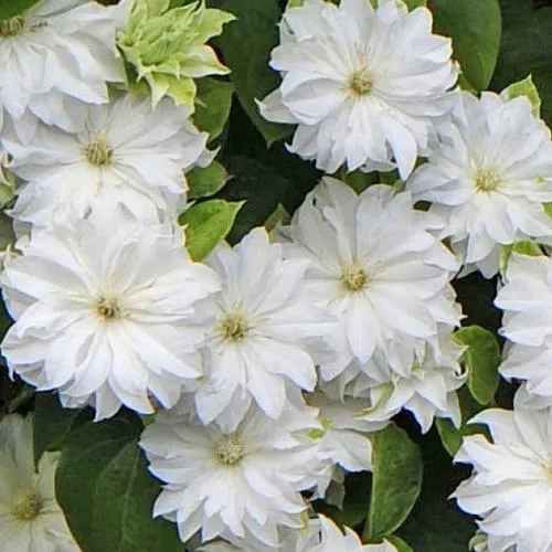 Цветы клематиса Мария Склодовская-Кюри – это настоящее произведение искусства. Каждый цветок состоит из множества гофрированных лепестков, достигающих размера от 12 до 15 см в диаметре. Формой они одновременно сферические и элегантные, а эллиптические лепестки с волнистыми краями придают цветку особую утонченность. Махровость цветков подчеркивает их роскошь, а золотистые тычинки контрастируют с белоснежной окраской, создавая поразительное визуальное впечатление.