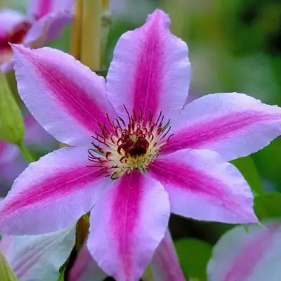 Цветы клематиса Нелли Мозер отличаются плоской формой и напоминают звезду. Каждый цветок крупноцветковый, может достигать 12–18 см в диаметре. Лепестки имеют форму заострённого эллипса и окрашены в нежный светло-розовый цвет, украшены яркими розовыми полосками в центре. Это сочетание делает цветы особенно выразительными и заметными на фоне зелёной листвы. Аромат цветков нежный и душистый, что придаст вашему пространству дополнительный шарм.