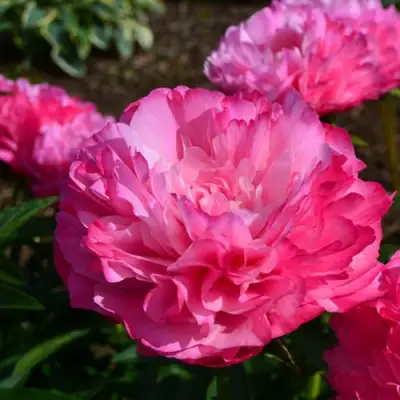 Цветы бывают крупными, диаметром до 18 см. Они имеют махровую розовидную структуру и поражают своим розово-малиновым светящимся цветом, который дополняется тонкой нежной розовой каймой. Яркость и насыщенность окраски делают этот пион настоящей жемчужиной среди цветочных культур. Цветы обладают бомбовидной формой и удлиненными лепестками, которые, несмотря на свою деликатность и хрупкость, придают растению неповторимую элегантность. Аромат практически неощутим, что делает его идеальным выбором для тех, кто предпочитает наслаждаться визуальной красотой цветка.