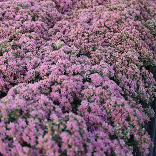 Цветение начинается в августе и длится до сентября: над ковром листвы поднимаются соцветия с пыльно-розовыми цветками, создавая контраст и усиливая визуальную глубину композиции. Растение невысокое — около 12–15 см, идеально подходит для оформления альпинариев, рокариев, бордюров, зеленых крыш. Смотрится органично как в групповых посадках, так и в соло-композициях.
