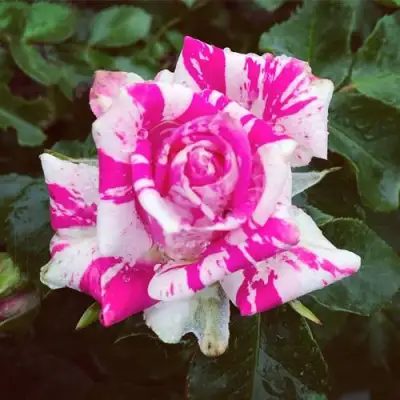 Бутоны роз "Флеш Данс" окрашены в нежный розовый цвет, который при раскрытии превращается в насыщенный малиново-розовый цветок с очаровательными белыми полосами. Эти двухцветные и полосатые цветы придают кусту особый шарм и необыкновенное изящество. Размер цветков небольшой, их диаметр составляет от 3 до 5 см. Цветки махровые, с 25 лепестками, что придает им пышность и объем. Цветы собраны в соцветия, на каждом стебле может быть от 5 до 10 цветков. Аромат цветов слабый, что делает их идеальными для тех, кто предпочитает ненавязчивые запахи.