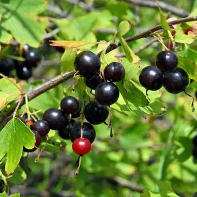 Листья средних размеров, трех- или пятилопастные, темно-зеленые, глянцевидные, сильно рассеченные, край листа острозубчатый, симметрично расположены по спирали. Основание листа прямое. Черешок красноватый с опушением. Почки средних размеров узкие с заостренной вершиной. Встречаются 5—6-летние плодовые веточки. Цветки среднего размера, пятирные, лимонно-желтого цвета. Пыльники желтые с темно-красной полоской посередине. Пестик зеленого цвета наравне с тычинками или выше. При отцветании венчик приобретает красную окраску. Ягода округлой формы, темно-фиолетовая. Кисть плотная по 7—8 ягод, длина — 5 см. Первые ягоды крупные — до 4 г. Средний вес — 1,7 г. Засохшие околоплодники собраны в трубочку, длинные.Кожица плотная. Мякоть – кисло-сладкая, с мускатным или черничным послевкусием.