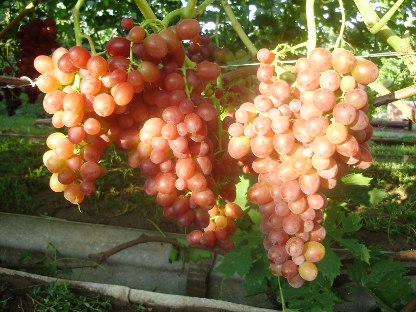 Грозди аккуратные, средней плотности, массой 600–700 г. Ягоды овальные, розовые, весом около 8 г. На солнечных местах окраска становится яркой, что делает урожай особенно декоративным. Мякоть сочная и мясистая, кожица тонкая и почти не ощущается при еде. Вкус гармоничный с выраженным мускатным ароматом, который особенно ценят любители свежего винограда.