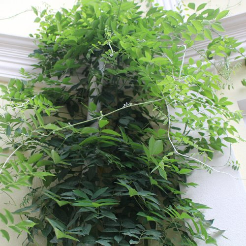 Листва перистая, крупная — 20–30 см длиной, состоит из 7–11 овальных листочков насыщенного зелёного оттенка. Летом лиана выглядит густой и объёмной, формируя плотный зелёный фон для последующих волн цветения.